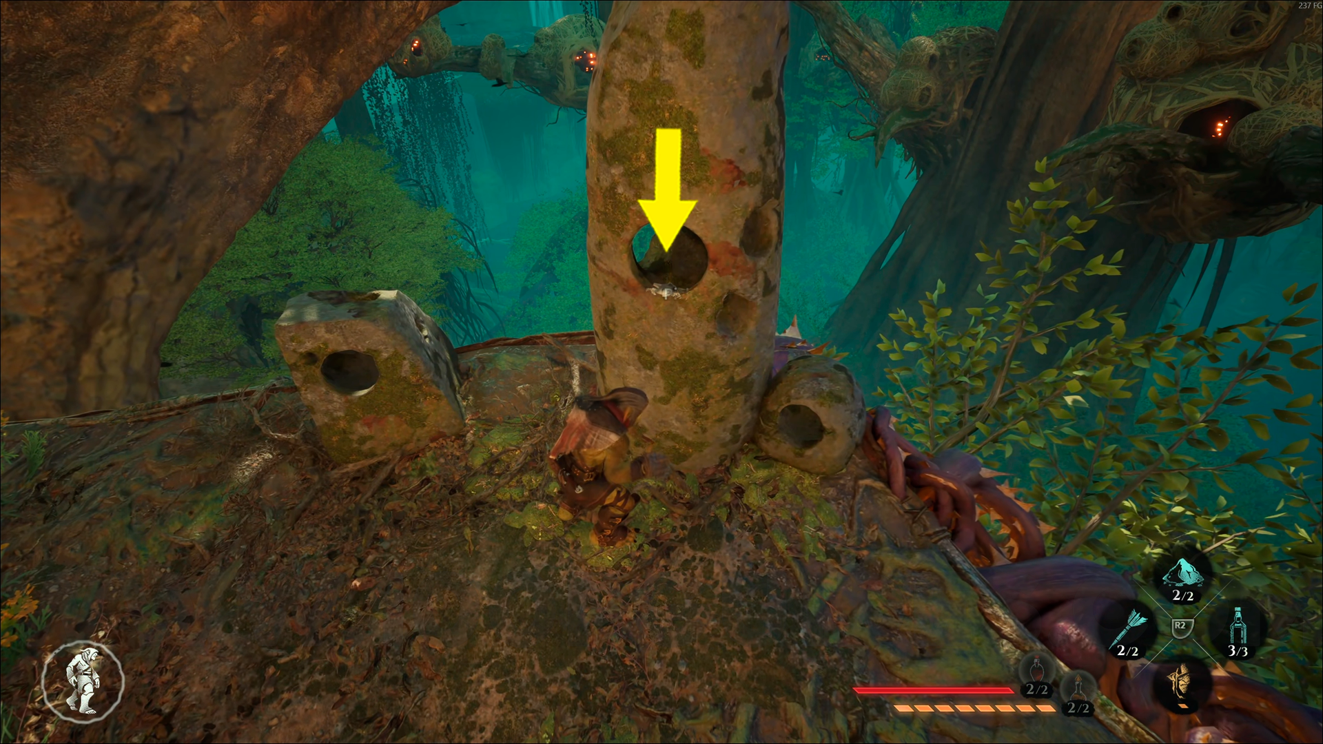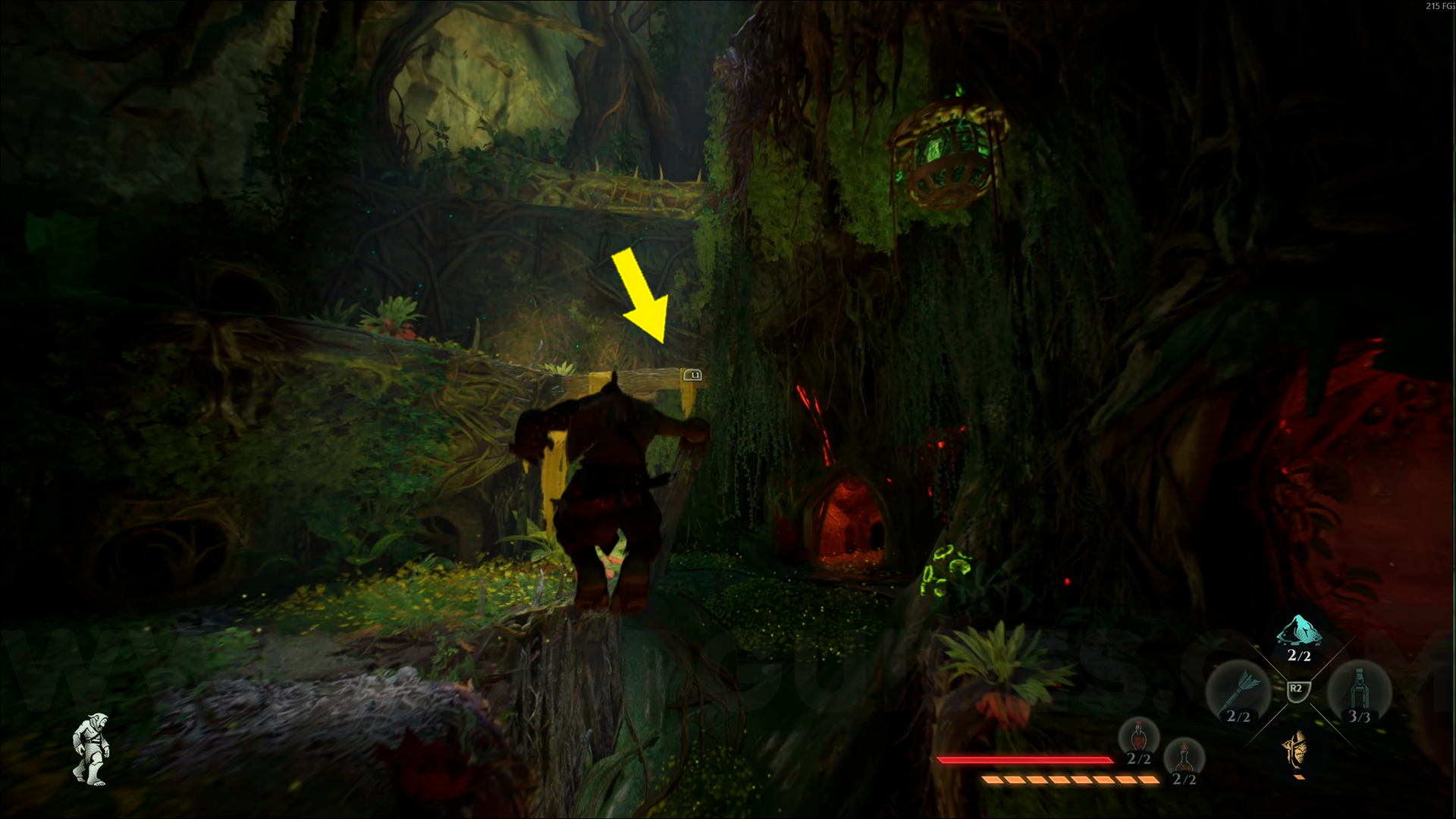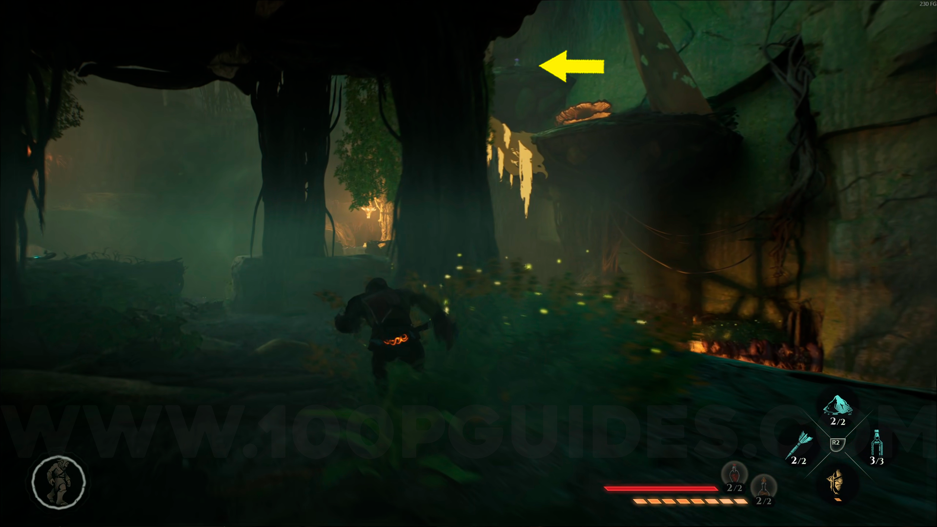Wood Emblem #2. From the Infested Swamp checkpoint, turn right and go down. Continue forward, go down another ledge, then turn right to find this emblem. Use Amber Vision to spot it through the wall.