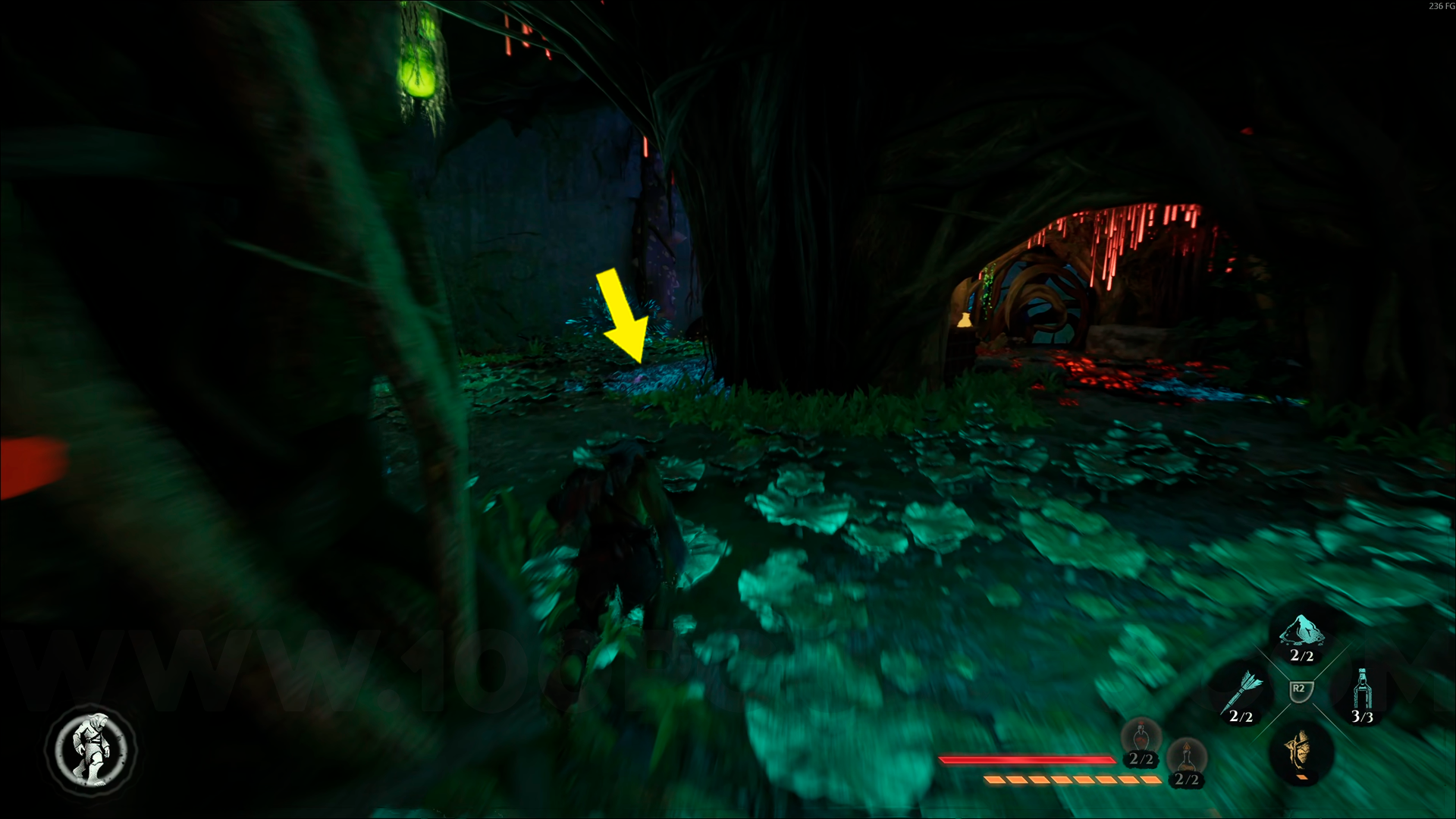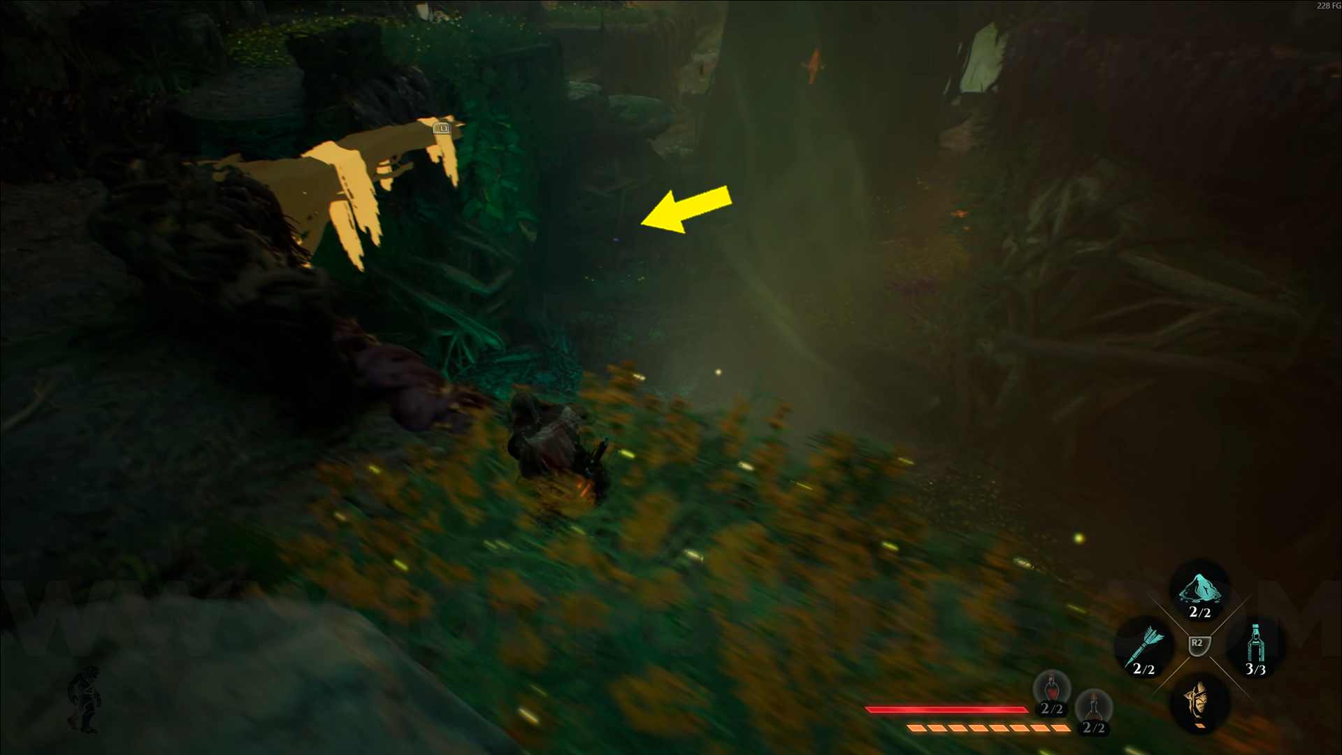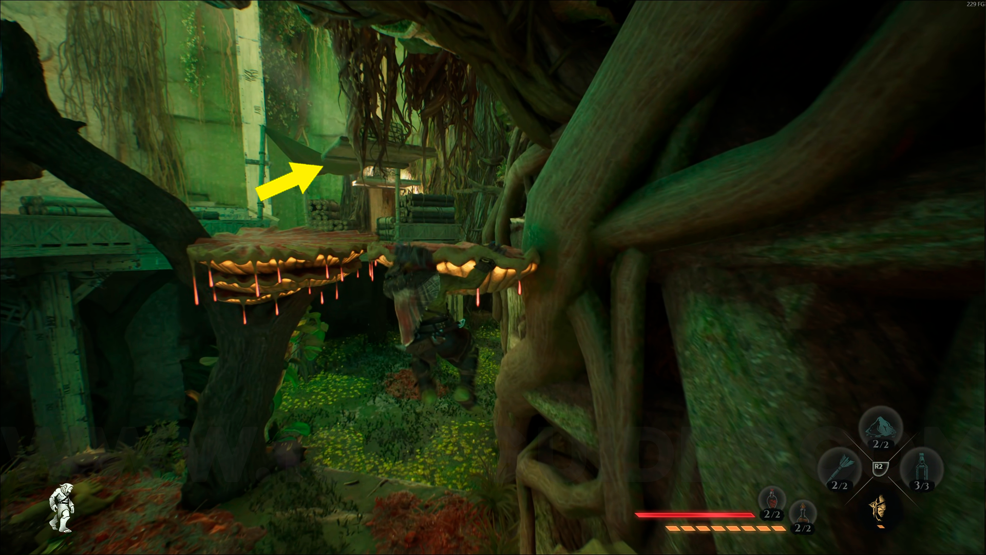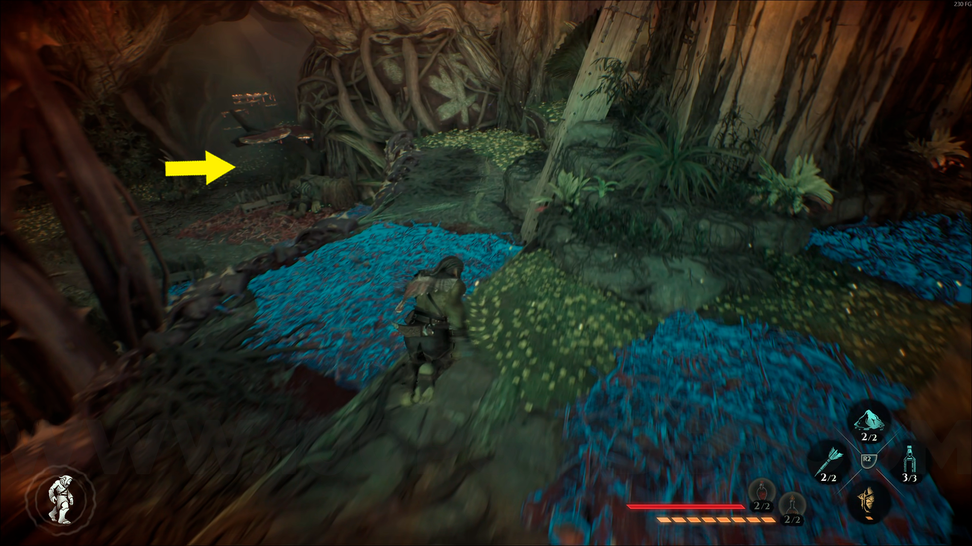 Wood Emblem #2. From the Infested Swamp checkpoint, turn right and go down. Continue forward, go down another ledge, then turn right to find this emblem. Use Amber Vision to spot it through the wall.
