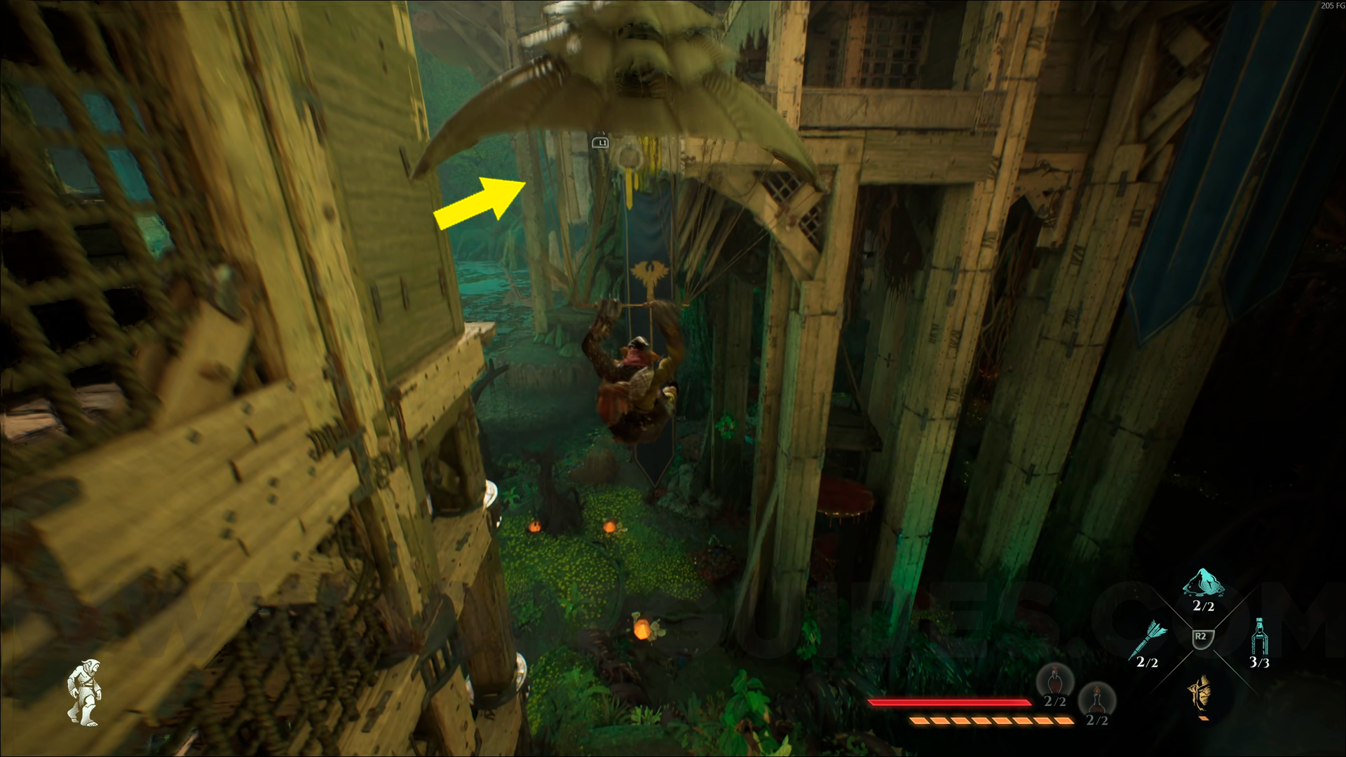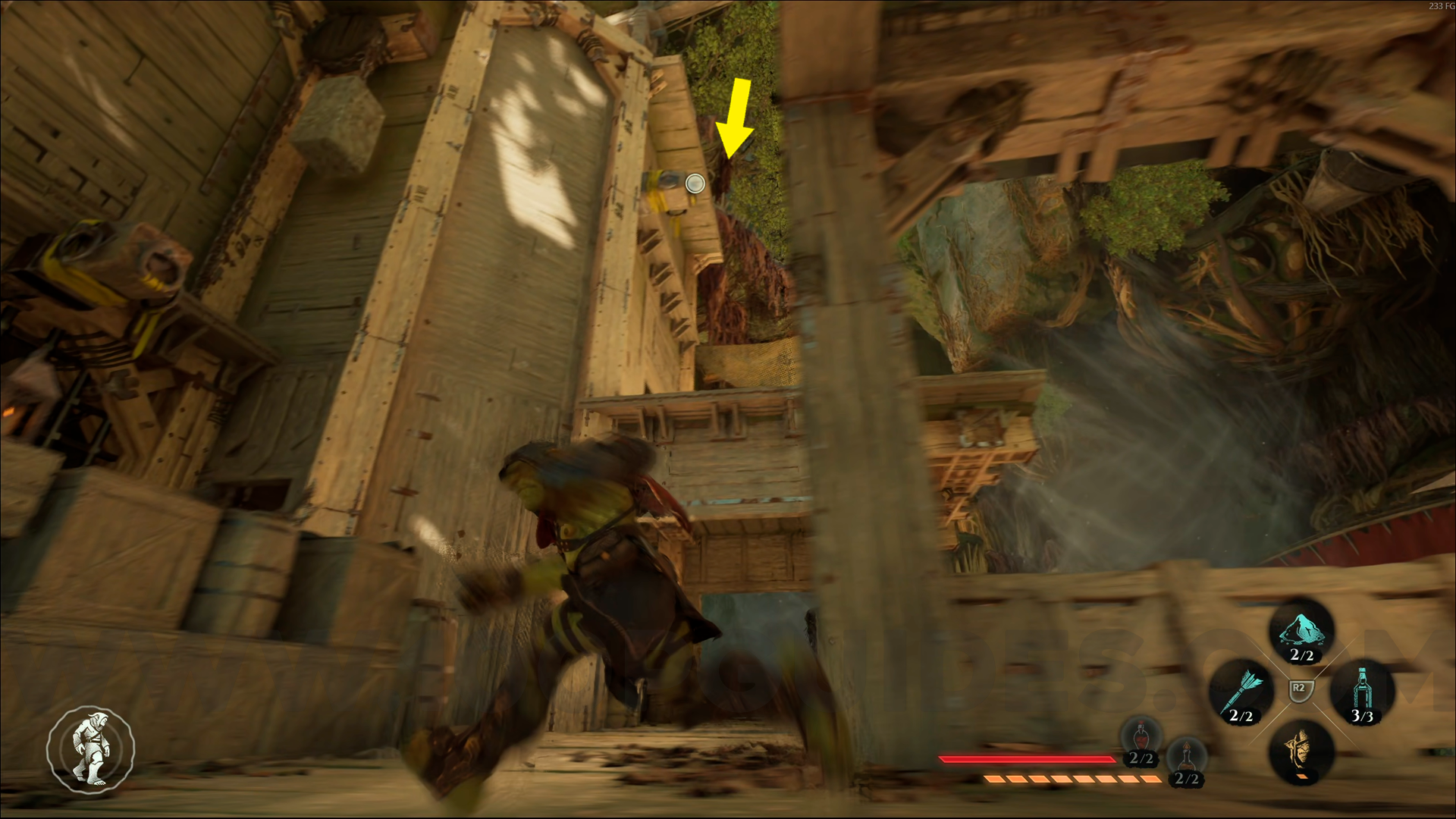 Gold Emblem #5. Right after the previous collectible, go back and use the grappling hook on the large wooden structure in the center. Then use the grappling hook on the scaffolding to the right and look down, you'll see a bird's nest with the emblem inside.