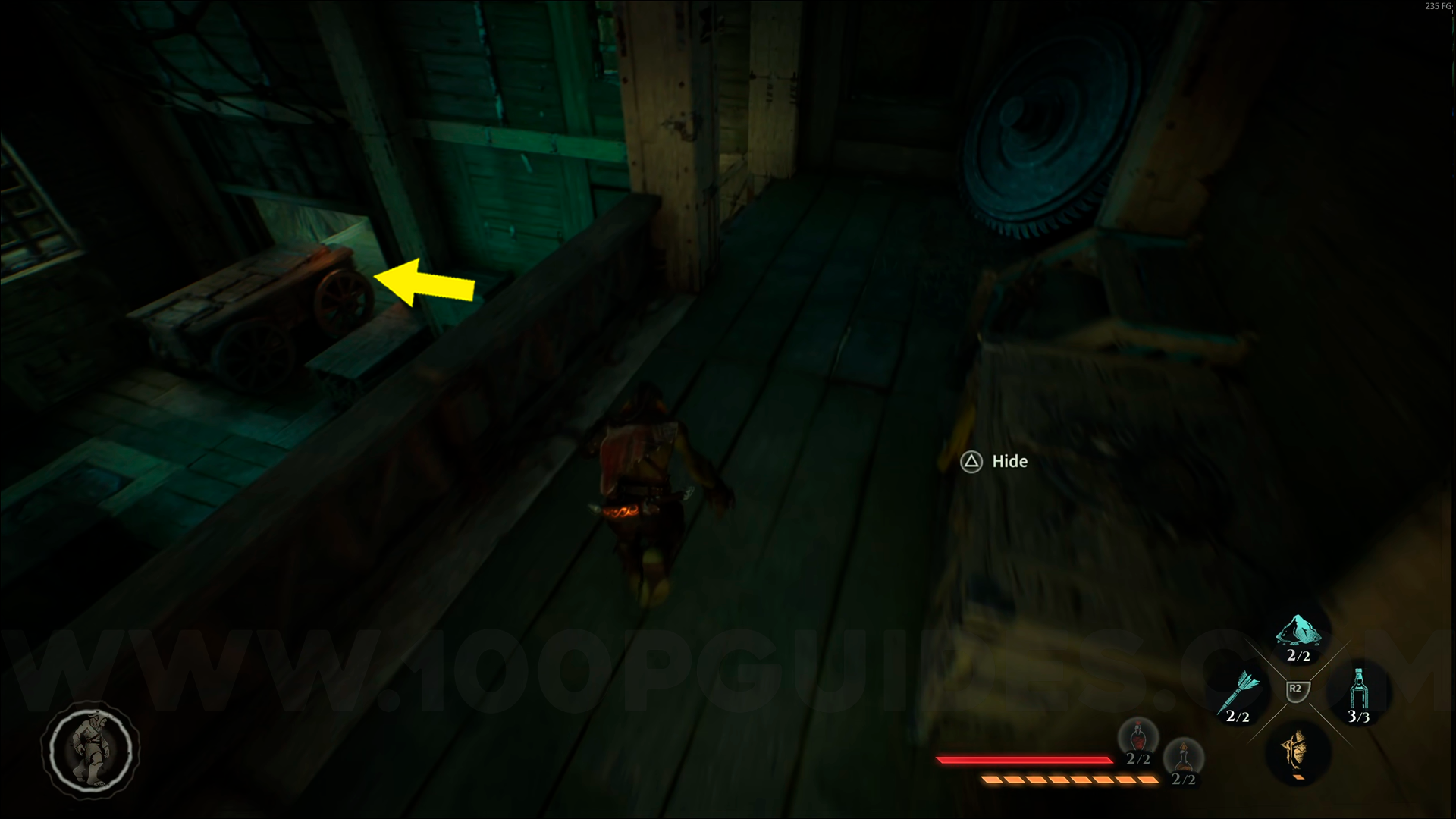 Wood Emblem #5. Right after the previous collectible, go down the stairs and look over the balcony you'll see a cart below. This emblem is underneath it.