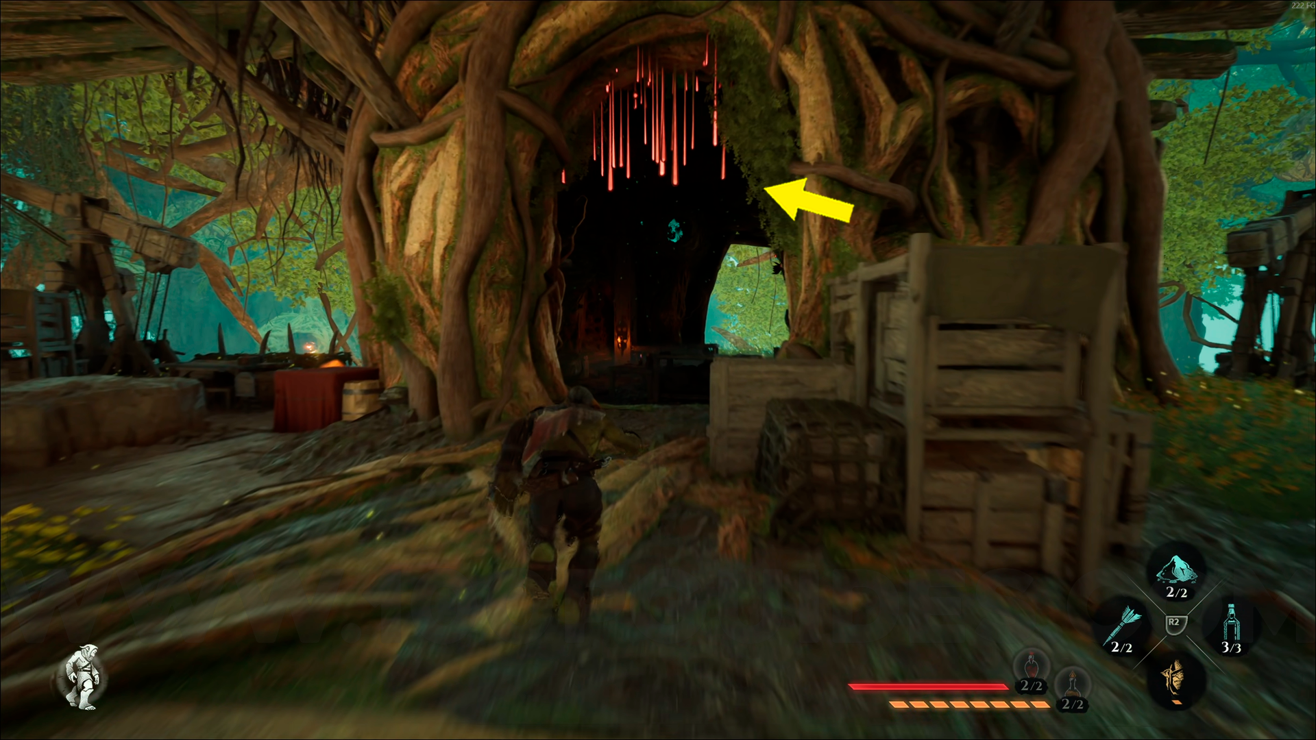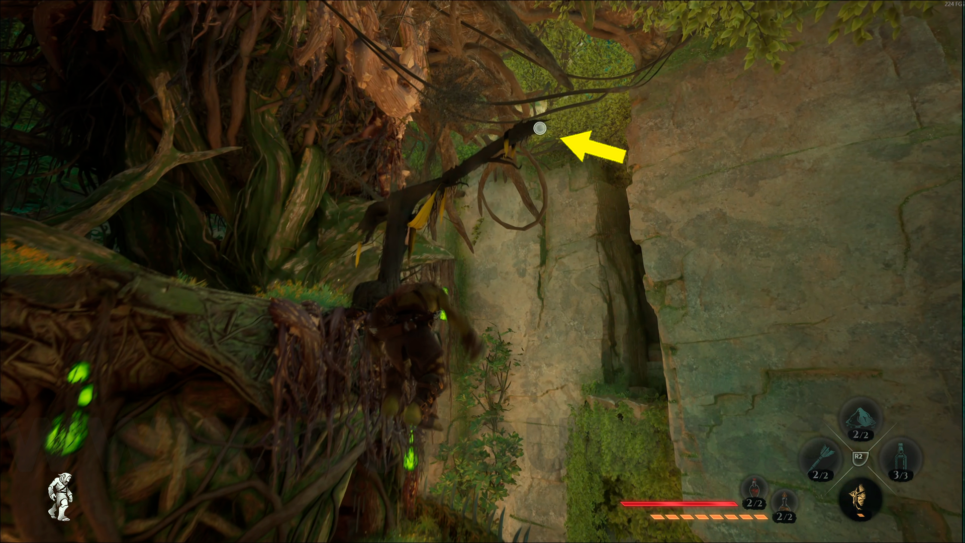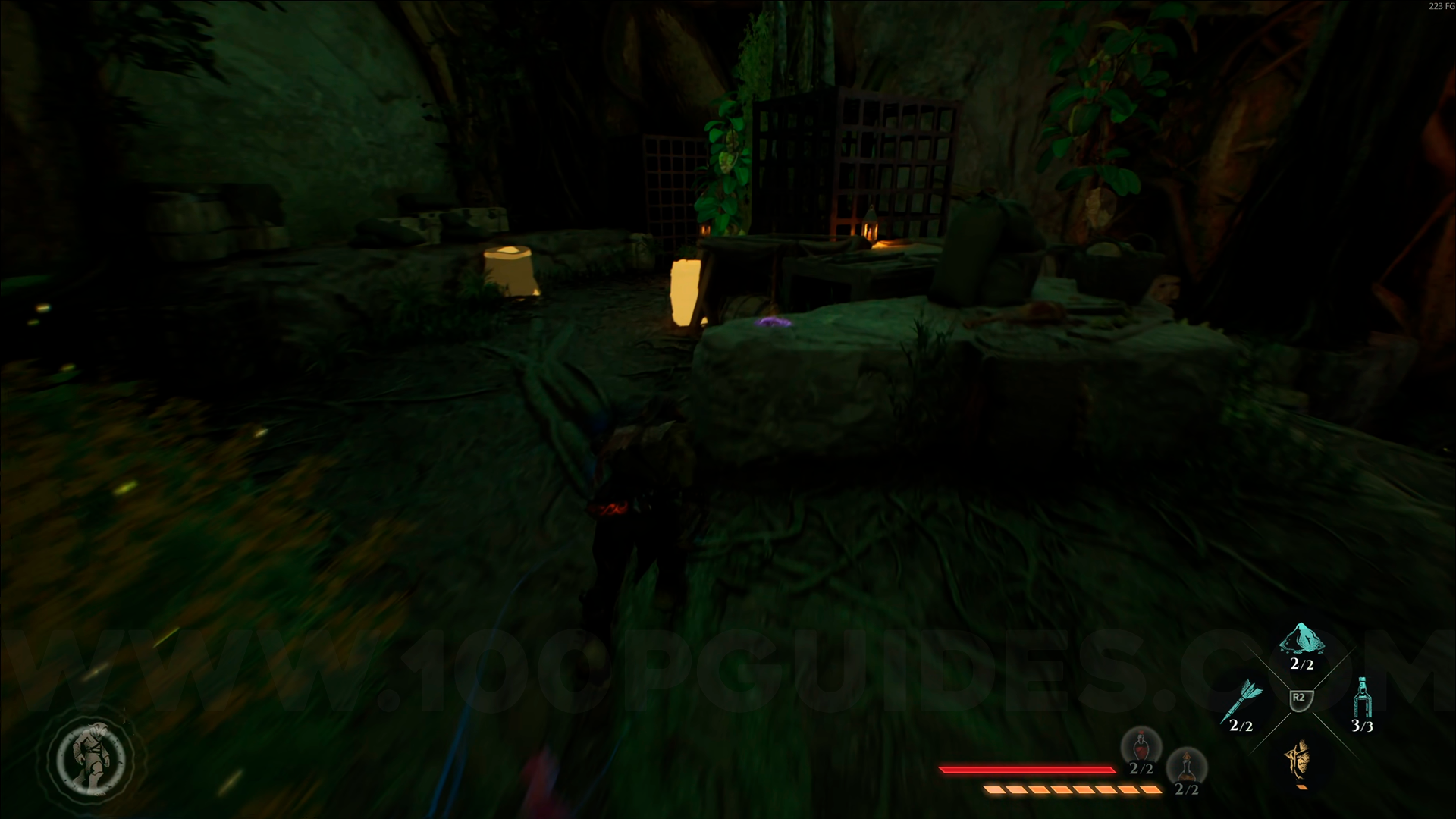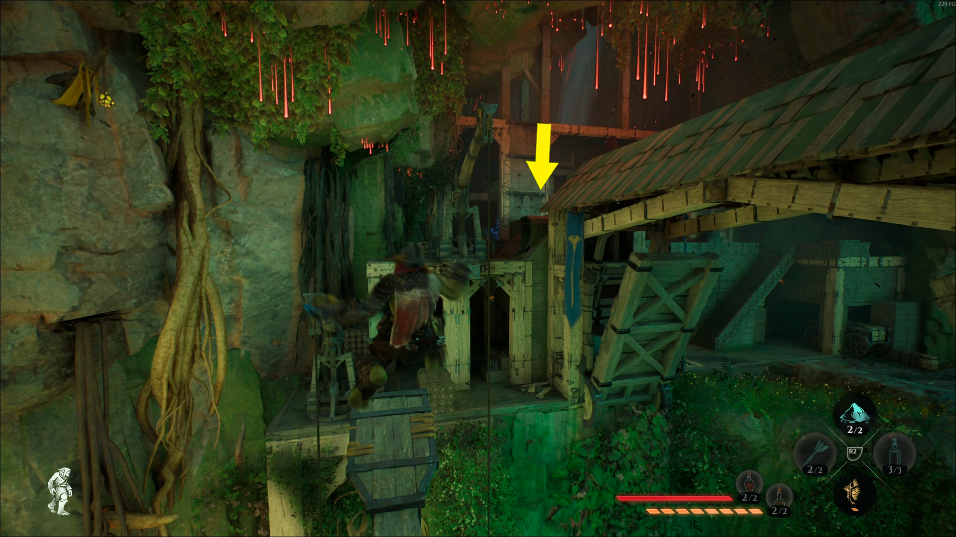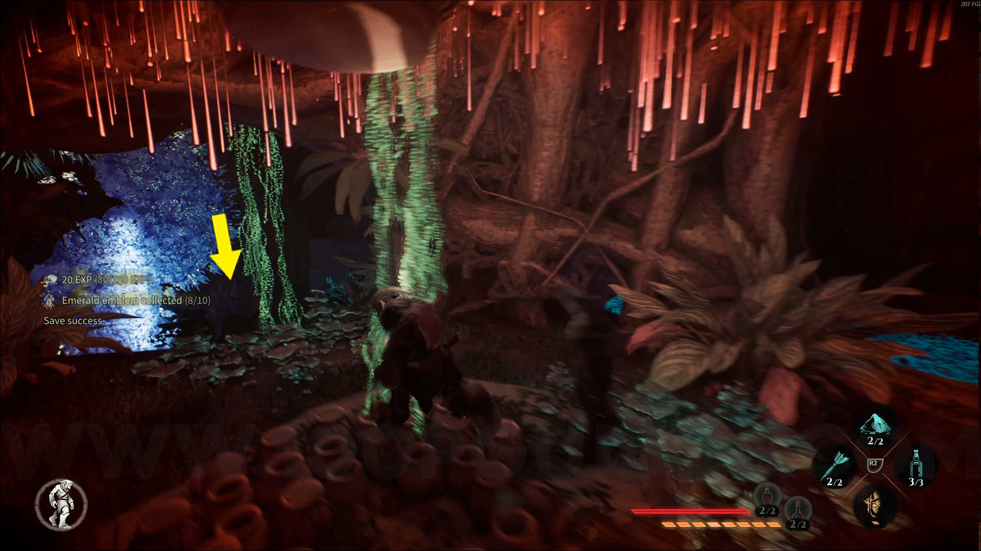 Gold Emblem #9. From the previous collectible, climb back down the way you came up and go around the large wooden structure with the blue flag. You'll reach another cave with red vines on the ceiling, inside, you'll find another emblem.