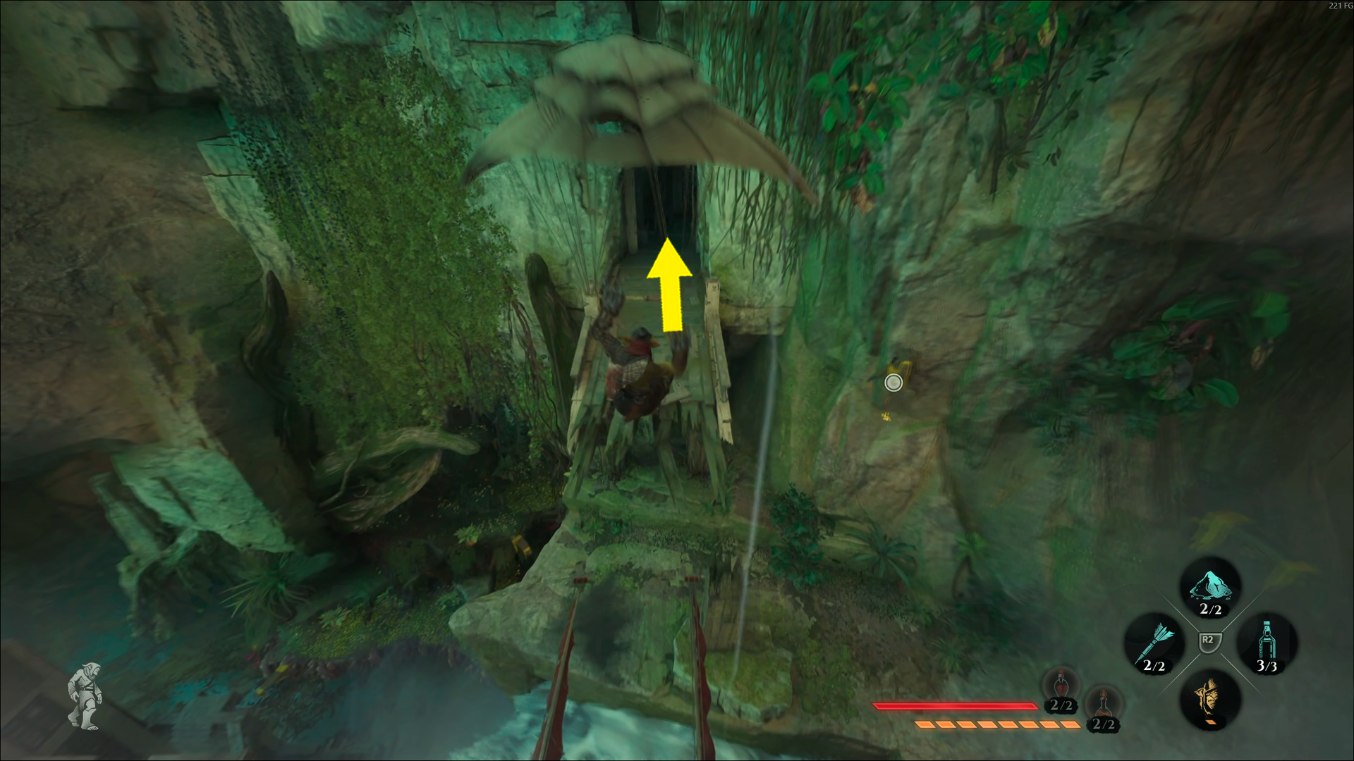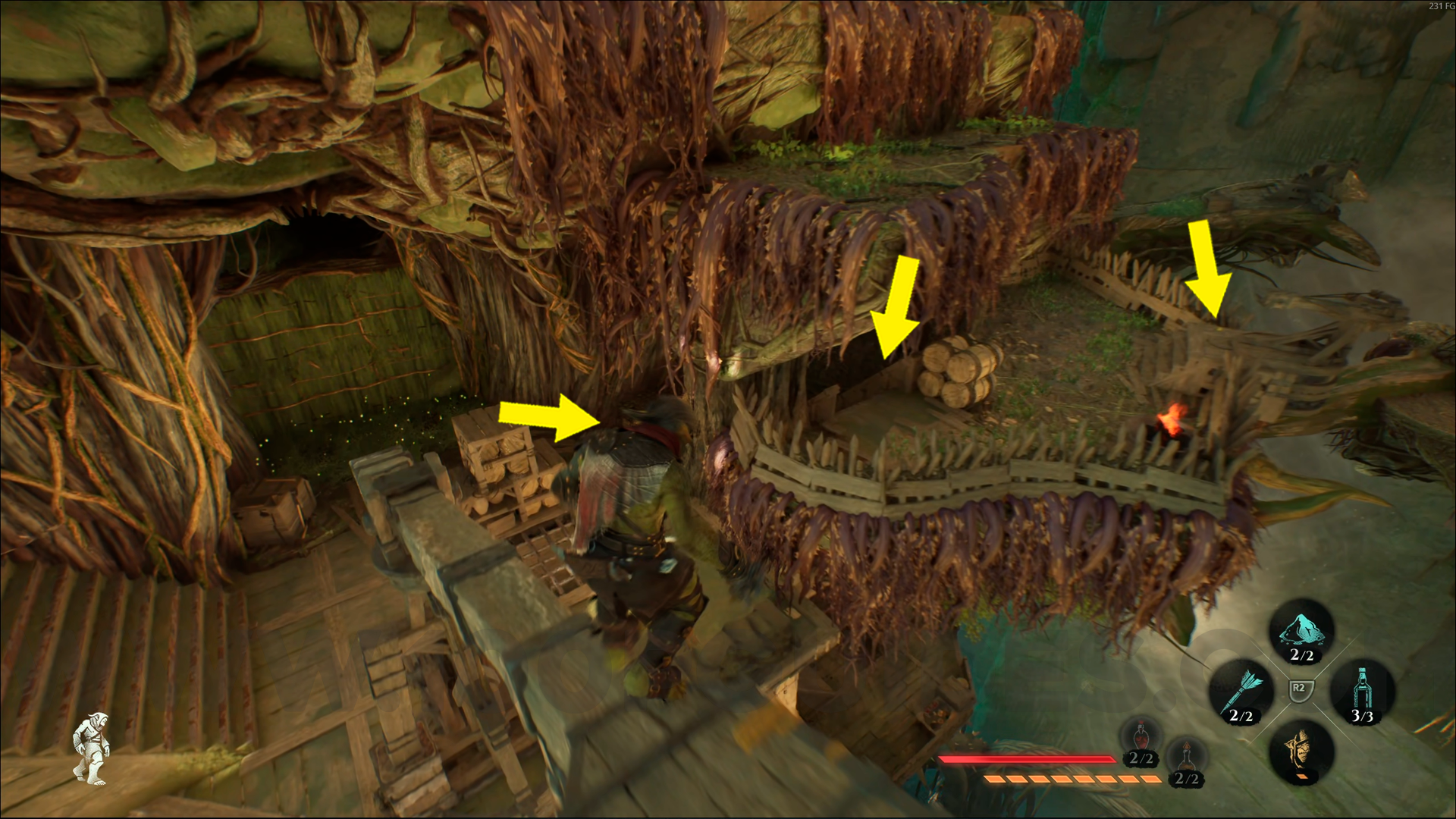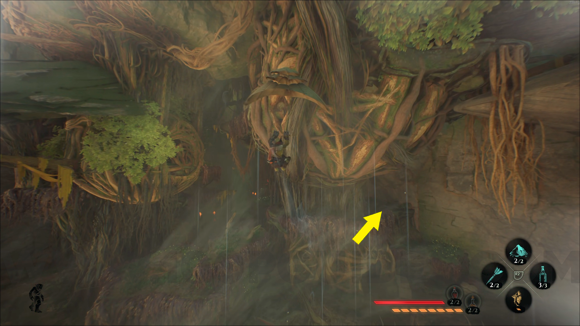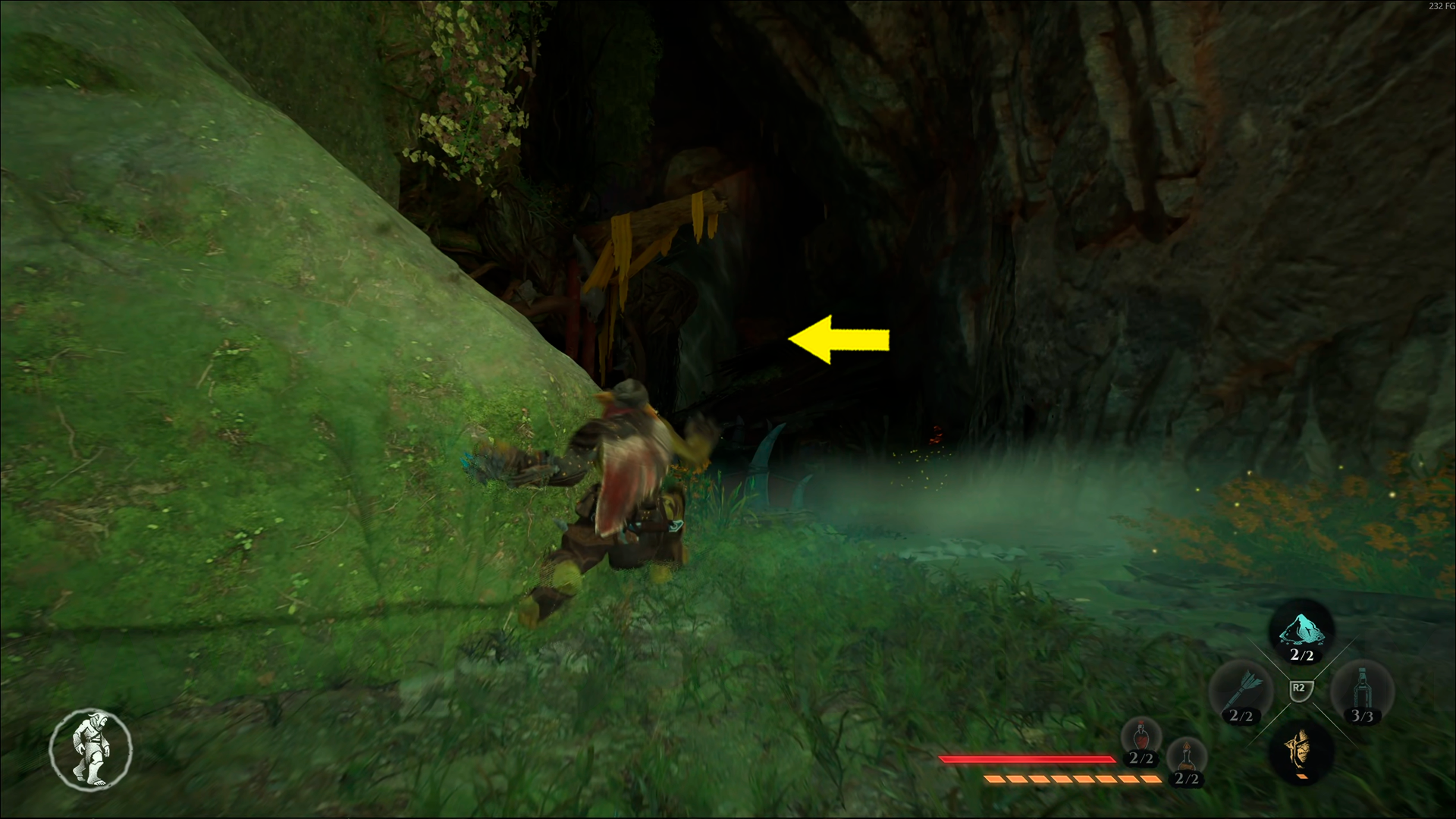 Gold Emblem #9. From the previous collectible, climb back down the way you came up and go around the large wooden structure with the blue flag. You'll reach another cave with red vines on the ceiling, inside, you'll find another emblem.