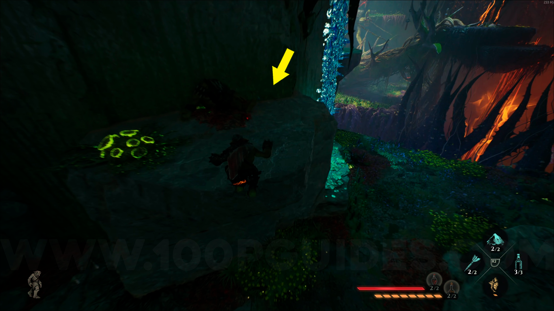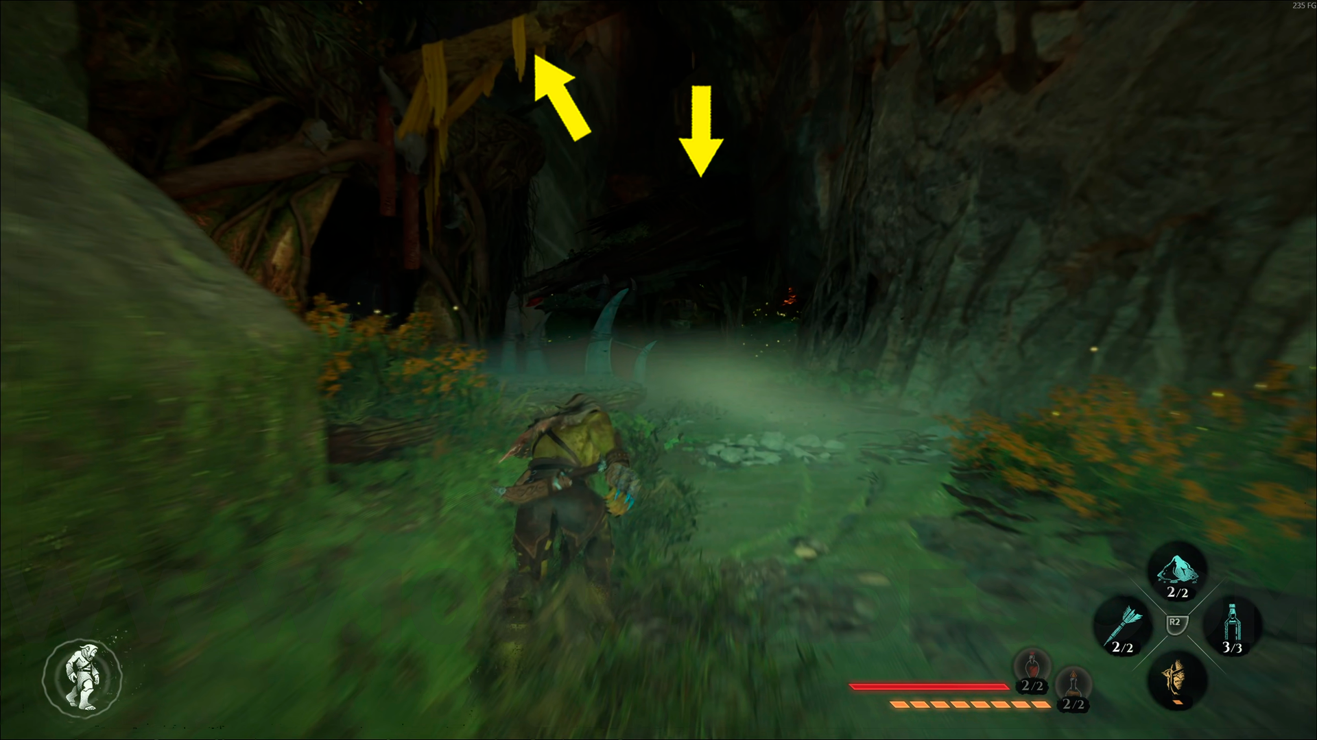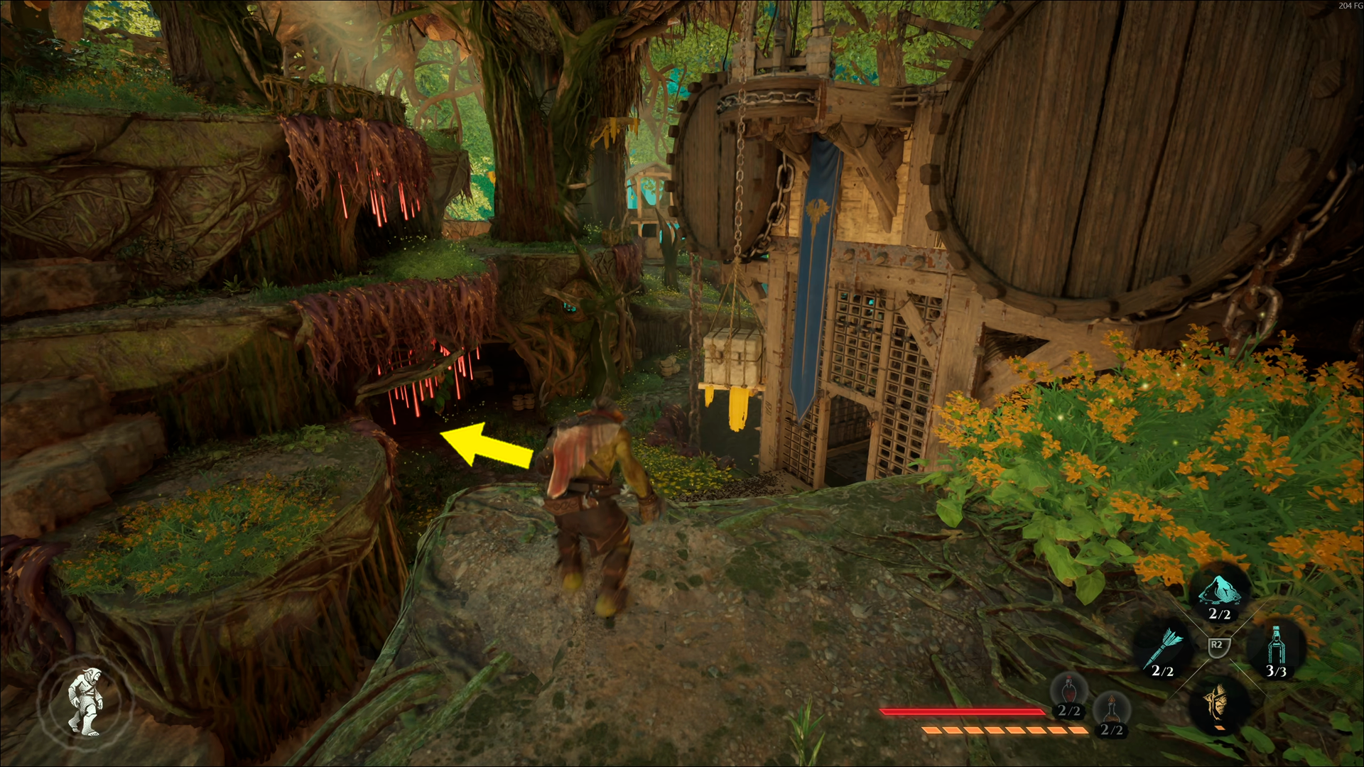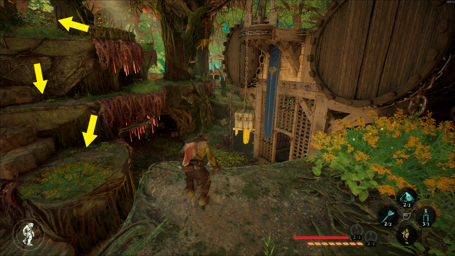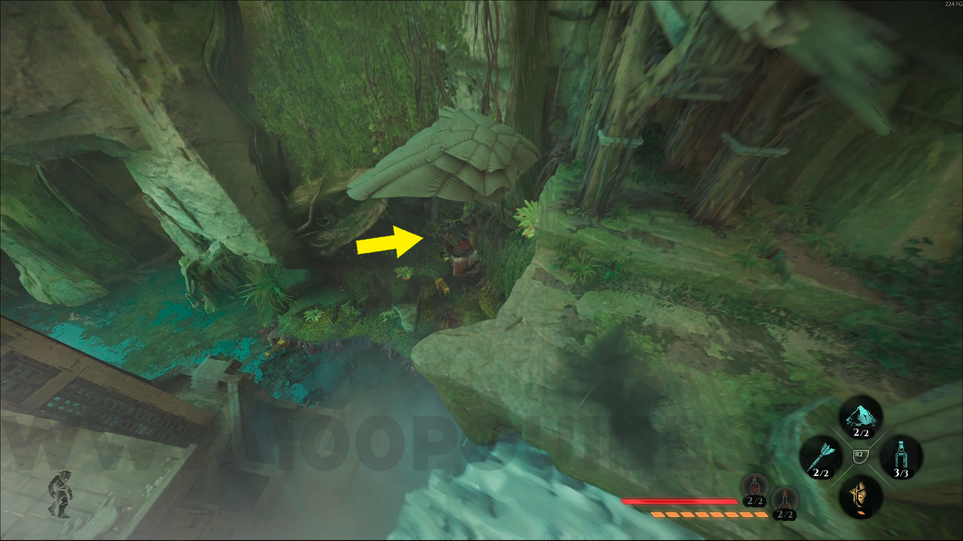 Gold Emblem #9. From the previous collectible, climb back down the way you came up and go around the large wooden structure with the blue flag. You'll reach another cave with red vines on the ceiling, inside, you'll find another emblem.