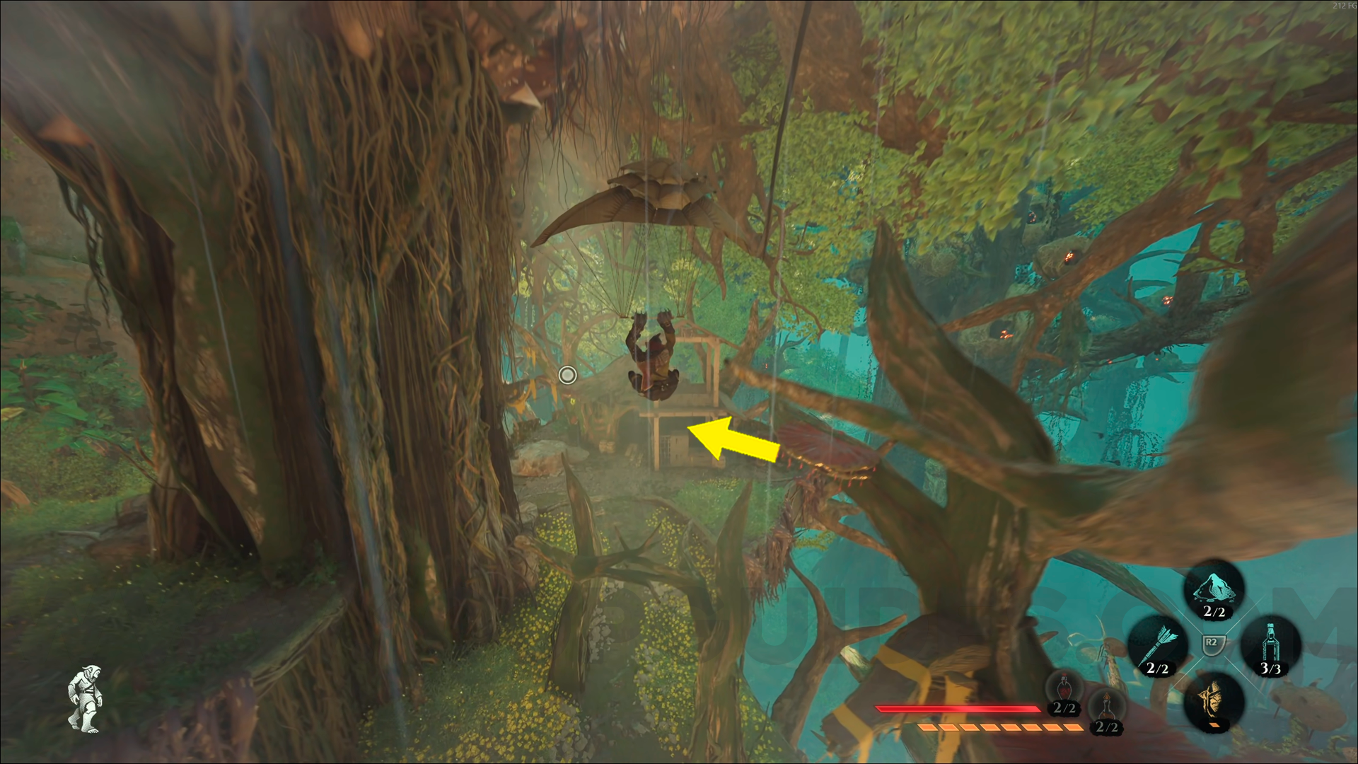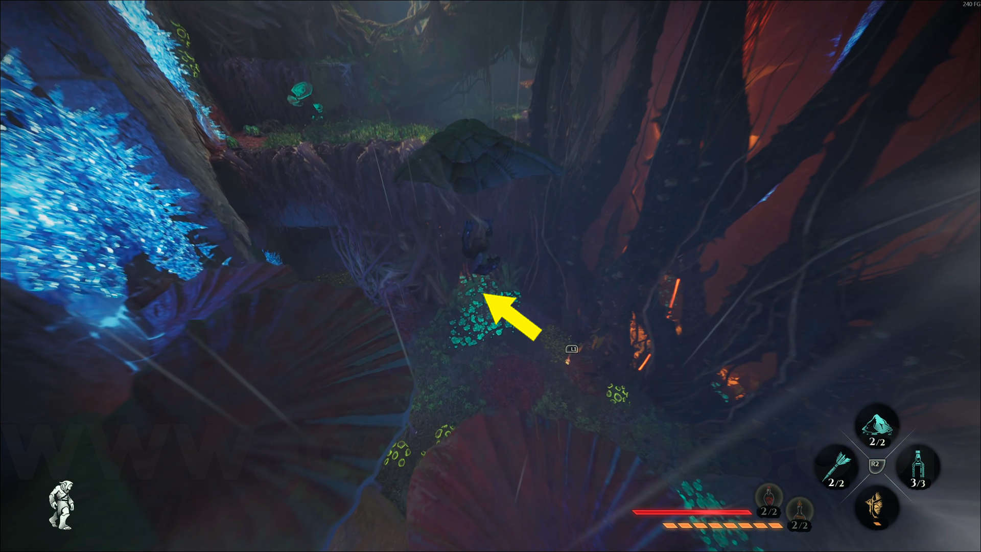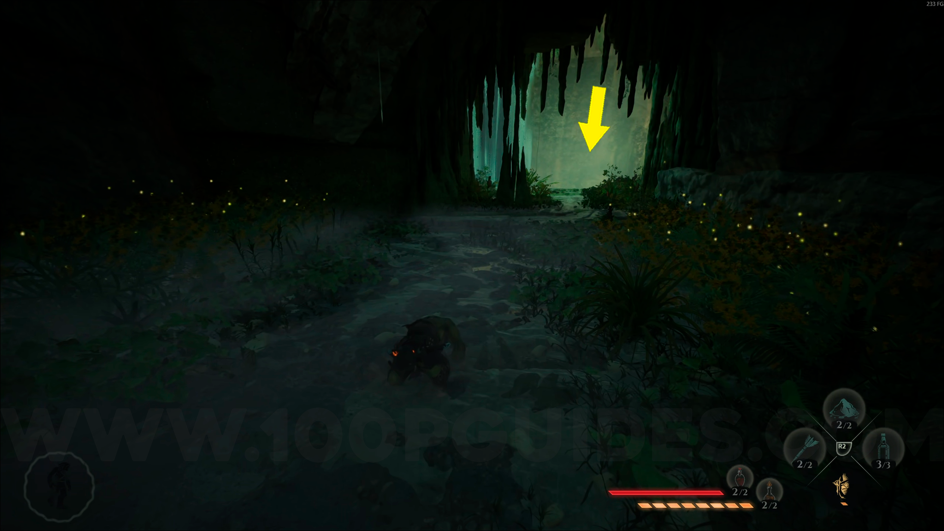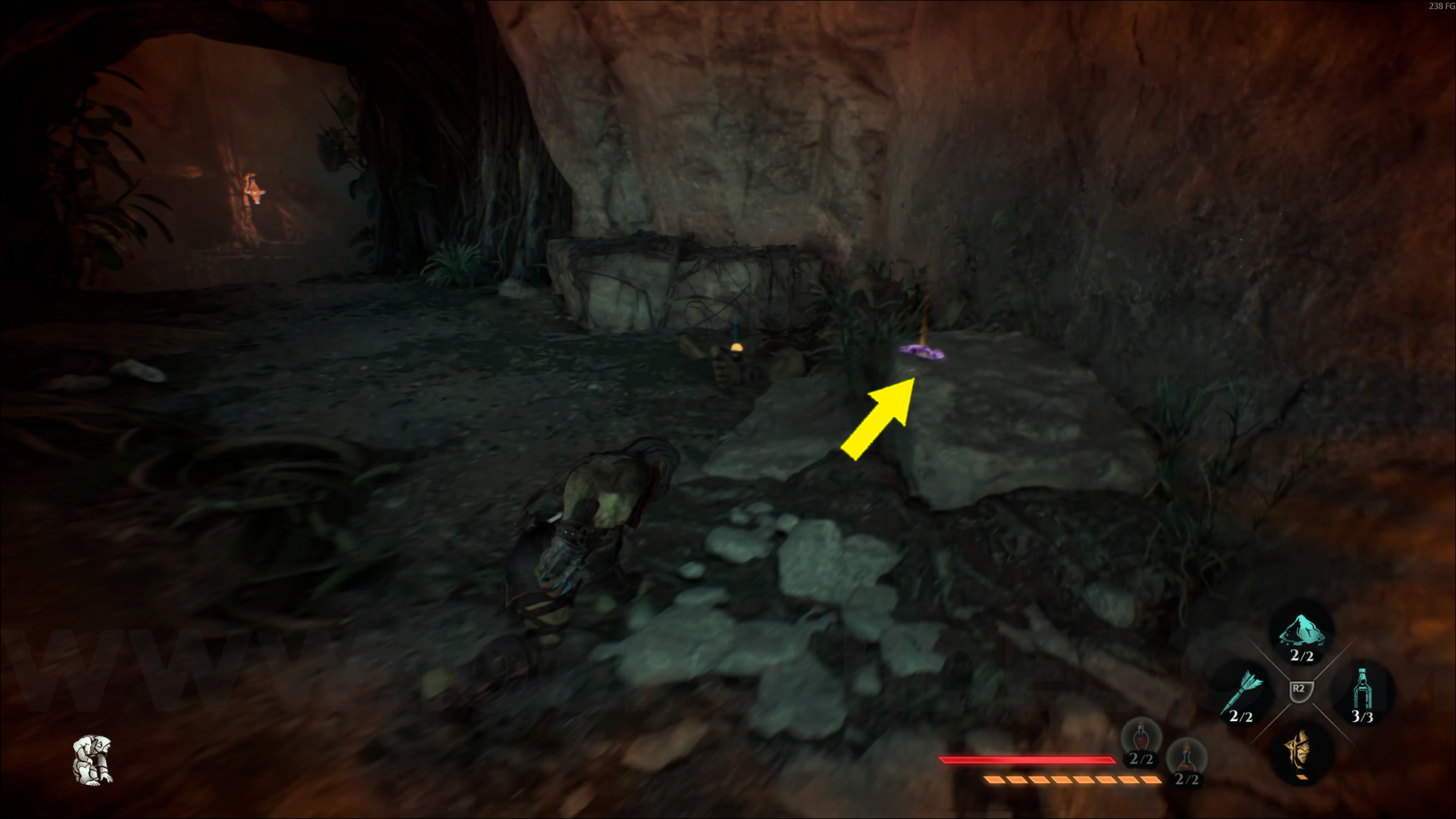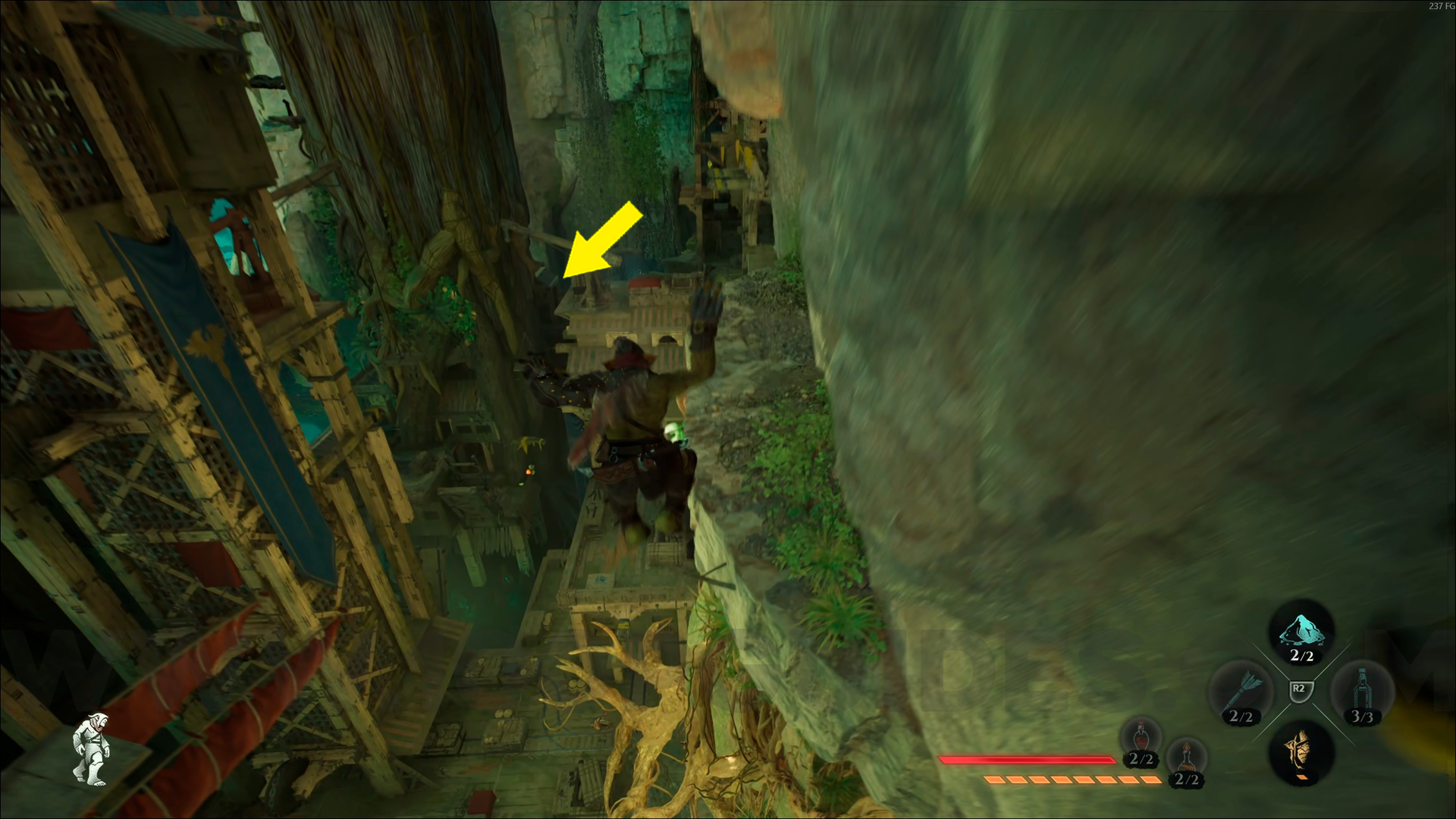 Gold Emblem #9. From the previous collectible, climb back down the way you came up and go around the large wooden structure with the blue flag. You'll reach another cave with red vines on the ceiling, inside, you'll find another emblem.