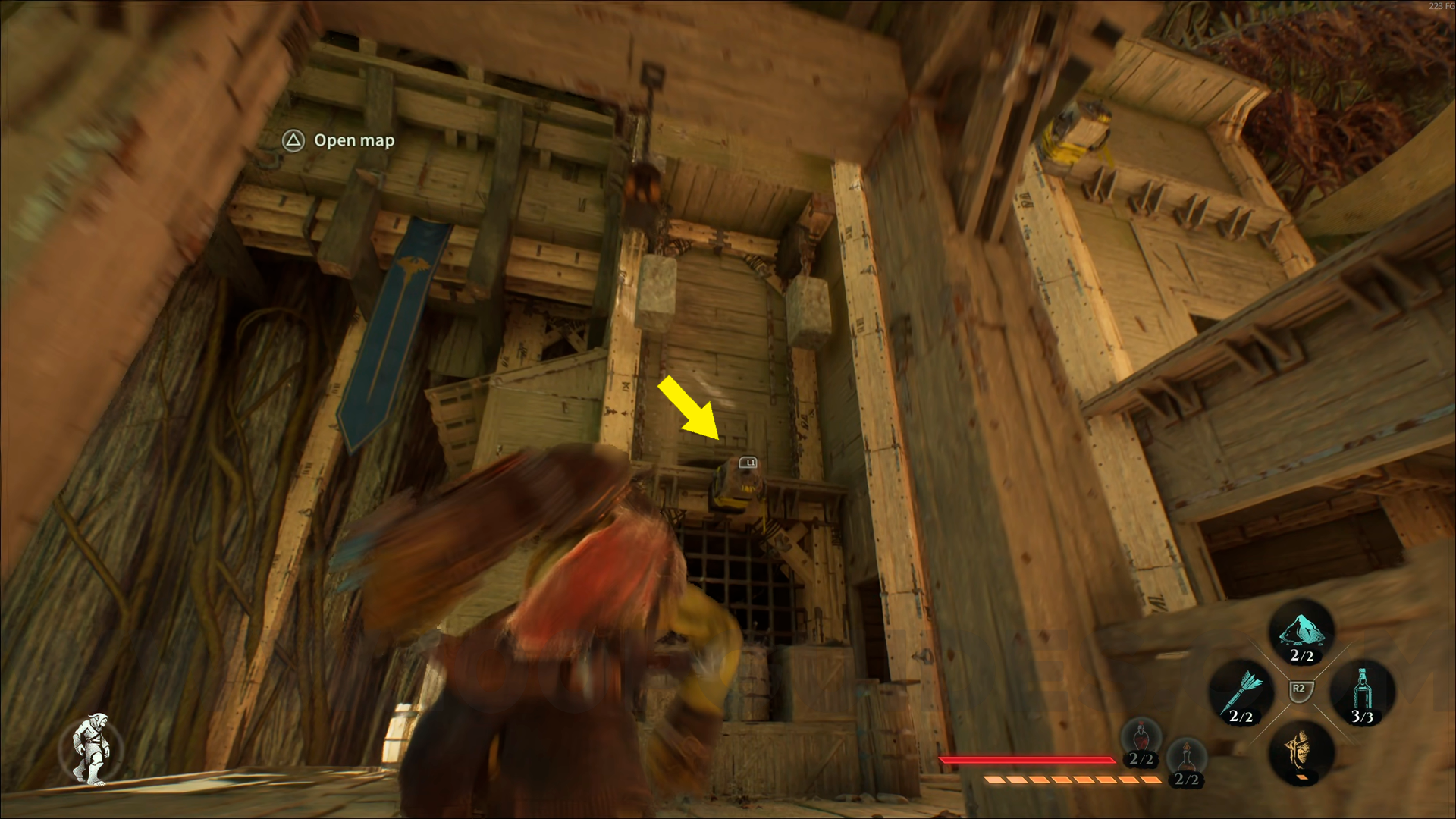 Gold Emblem #7. From the previous collectible, return to the central area with the large wooden structure, you'll see a cave on the left. Enter it, and you'll find a cage with this emblem inside.