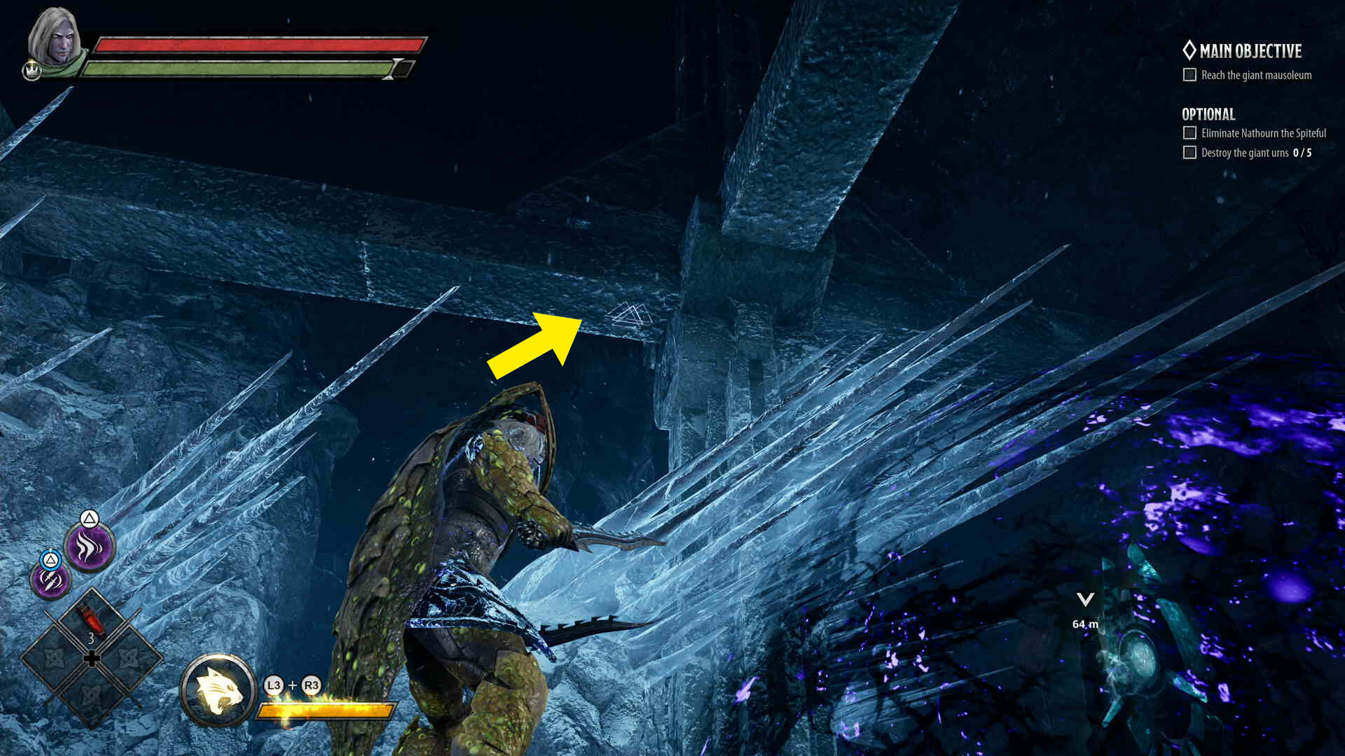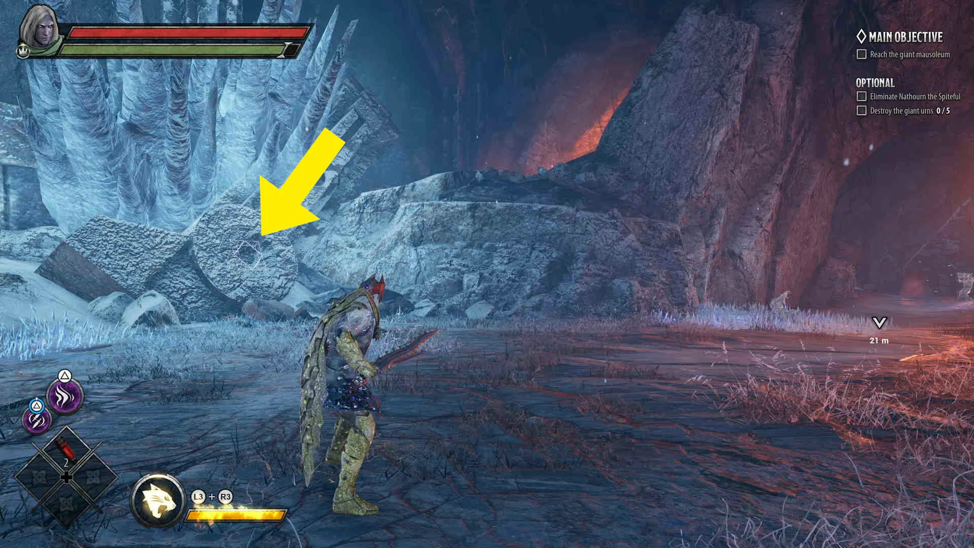 2. The next symbol you can find by going through the cave and taking a left after getting the buff from the flame sword, now you will be in the puzzle area, here look for a pile of rocks that you can break near the massive skeleton, the symbol can be found under them.