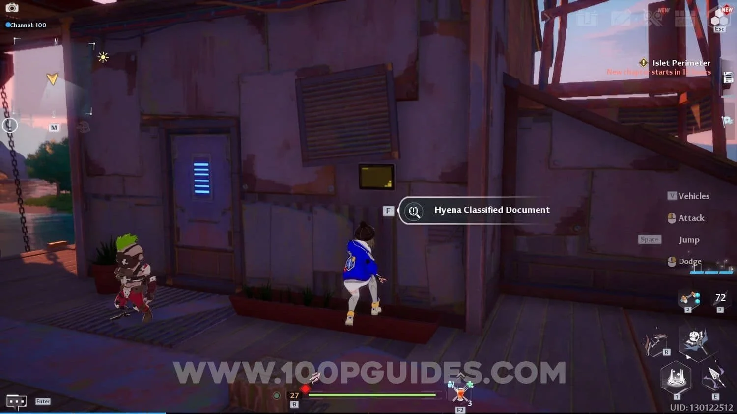 Once on the island, get the documents on the wall next to a door.