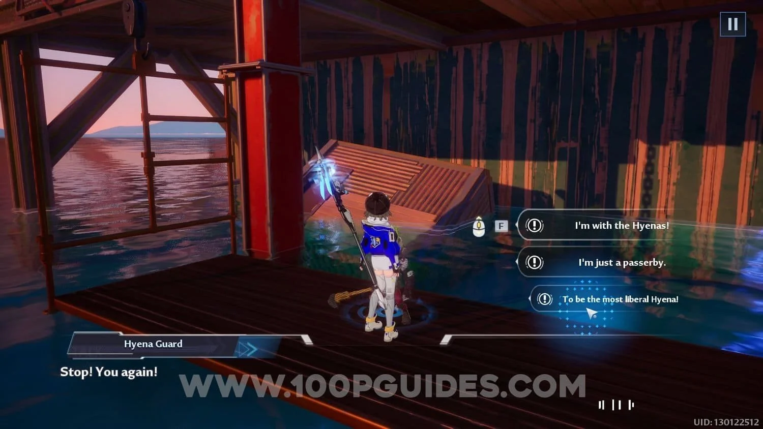 Return to the Hyena Guard and select the bottom option every time.