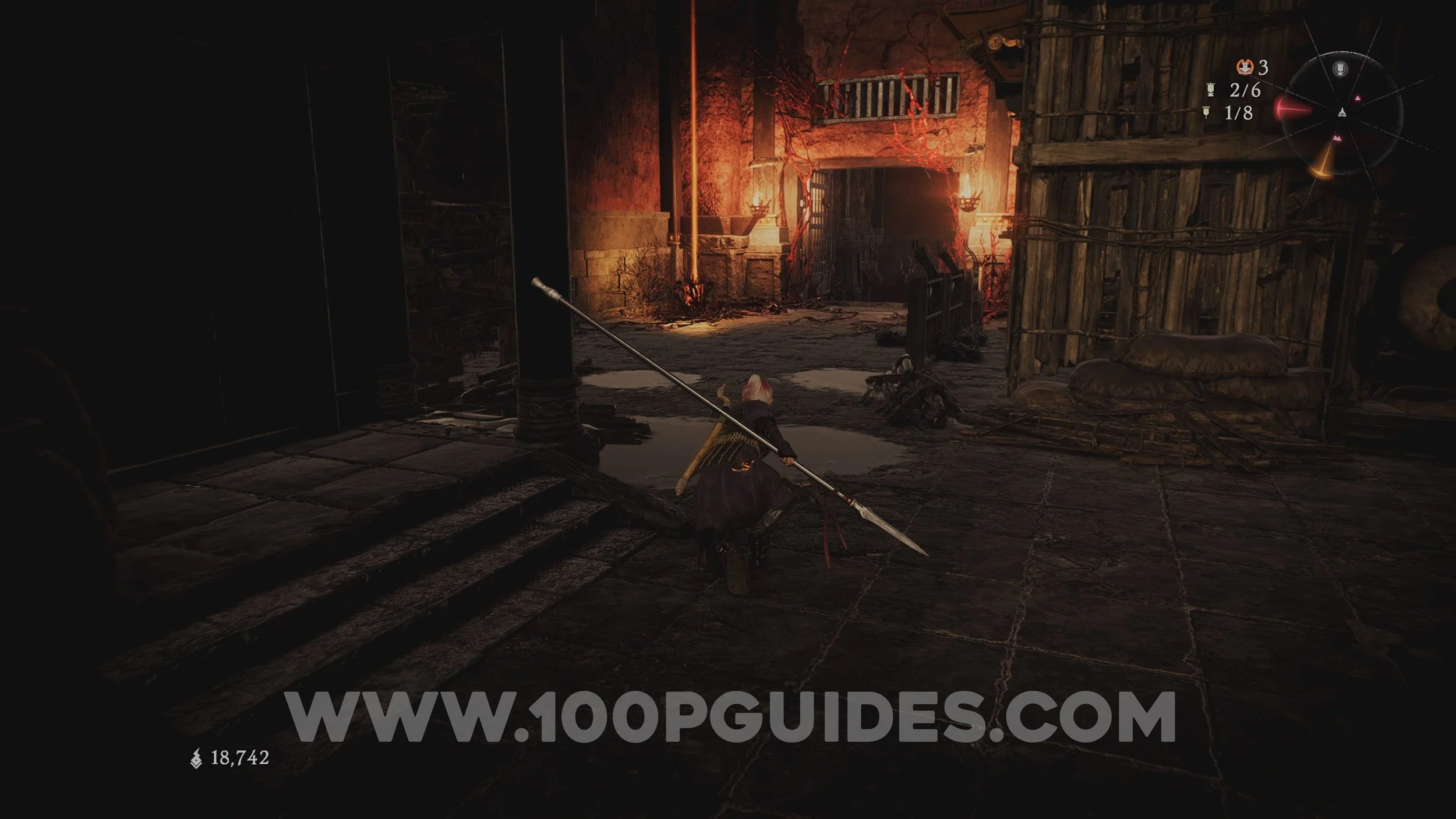 Marking Flag #8. Return to where the boar mini boss was. Here, go up the stairs to the big building. Just before you enter the door at the top (where the boss is found), head around the left of the building to find the flag.