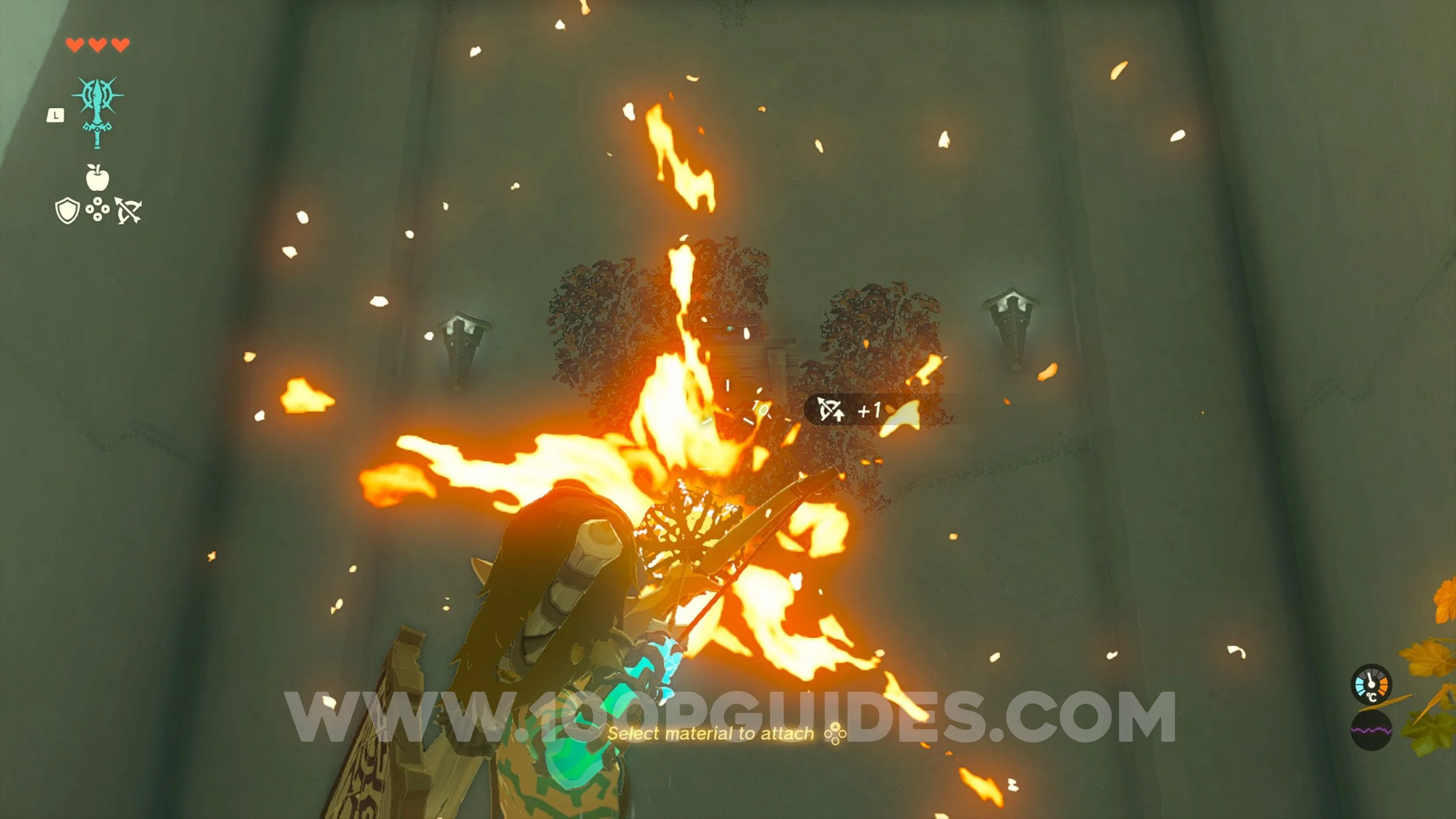 Next, go to the right and pick some fire fruits. You will now have to use a bow (you can find one in this area if you don’t have one) with the fire fruit (Aim and press the UP button on the d pad to fuse the arrow with the fire fruit) to burn the vines and wooden platform on the wall in front of you. This will allow you to get small key from the chest.
